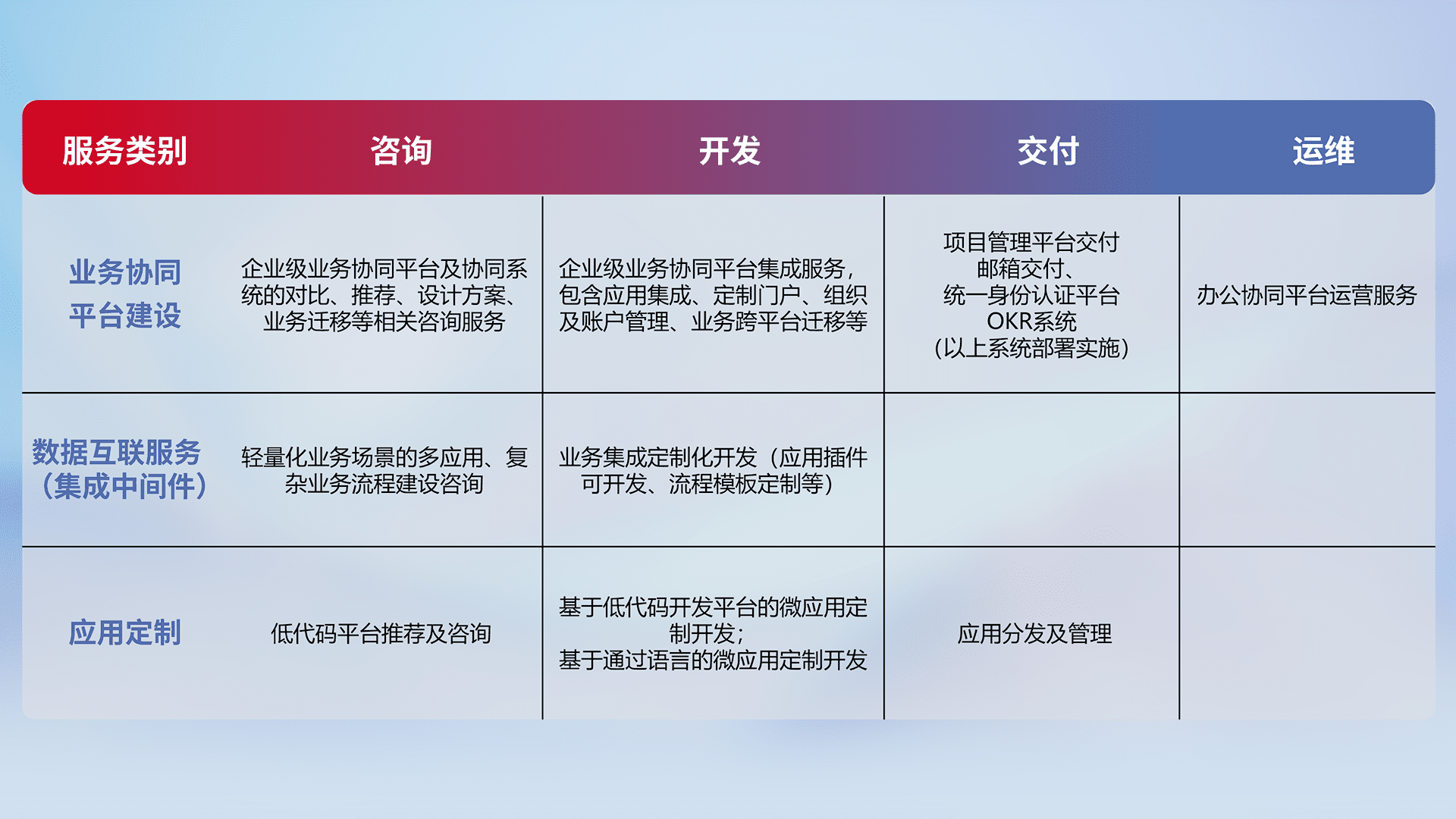 针对钉钉、、、企微、、、IDaas等平台级产品提供产品的规划、、方案、、交付、、定制化开发等服务,,,实现如统一协同办公、、、智能客户服务、、混合会议管理、、、智能数据查询、、等业务场景,,,,实现数字化转型。。